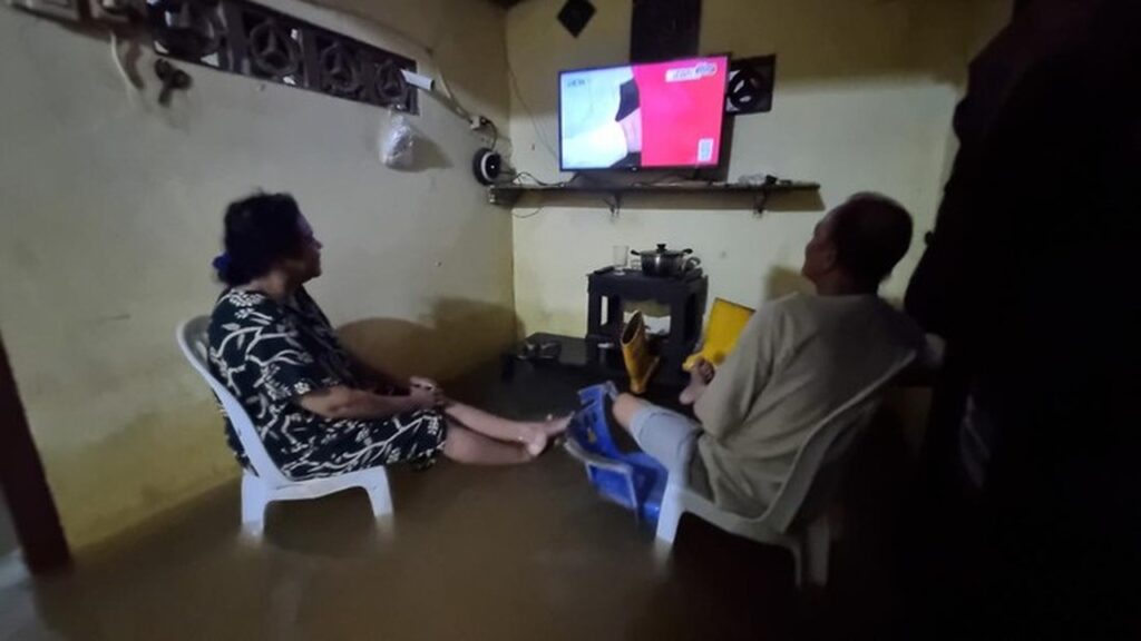 Meskipun rumahnya terendam banjir, seorang warga bernama Suti (60) memilih untuk tetap bertahan bersama suaminya. Ia mengaku memilih bersantai menonton sinetron di rumahnya yang tergenang air.